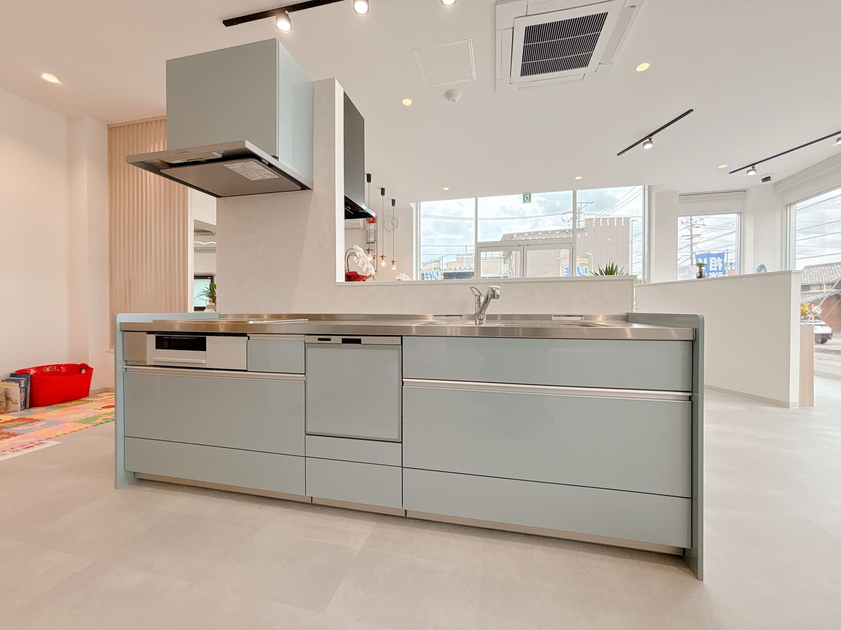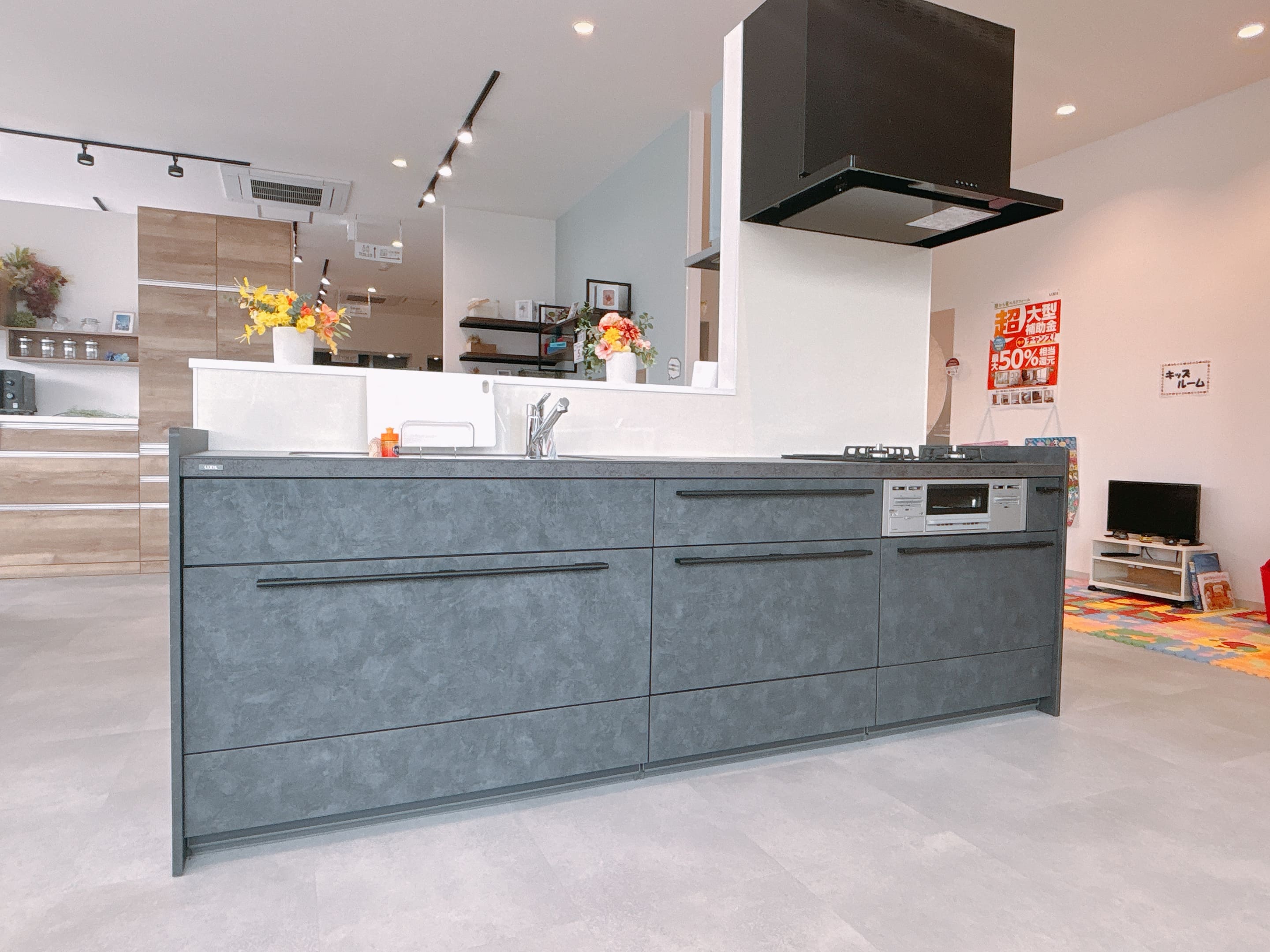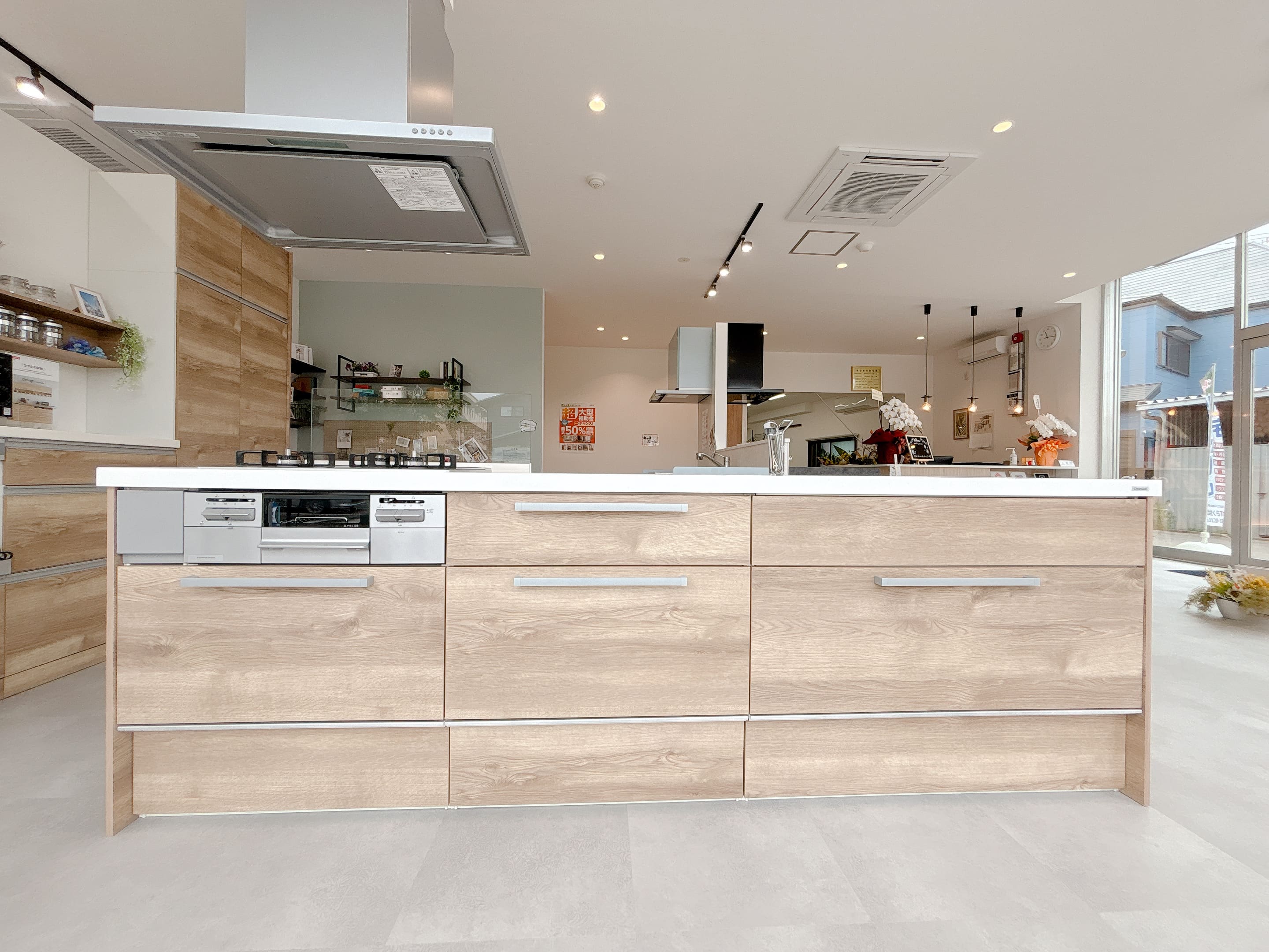 ショールームでは、開放感のあるアイランドキッチンタイプを展示しています。実際のサイズ感やデザインをぜひご覧ください。