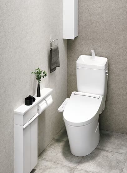 まず、見た目は写真のように無駄のないすっきりとしたデザインに、やわらかな丸みを帯びたフォルム。「アメージュ便器+KB31」は、どんな空間にもなじむ清潔感のあるトイレです。