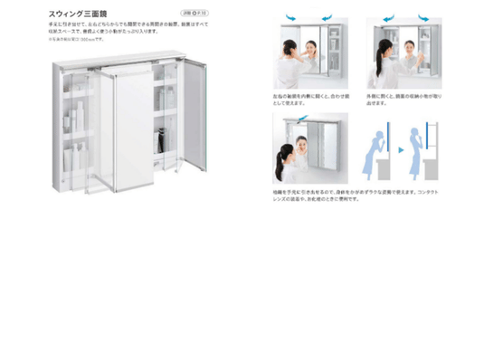 外側に開く事や身を乗り出すことなく鏡を正面に近づける使い勝手がパワーアップした三面鏡。