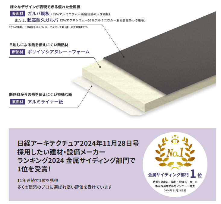 表面にはガルバリウム鋼板(アルミ亜鉛合金めっき鋼板)を採用。