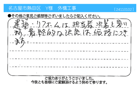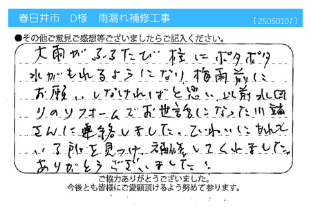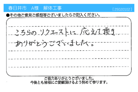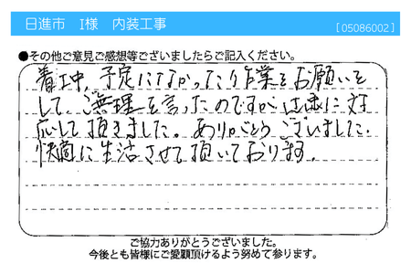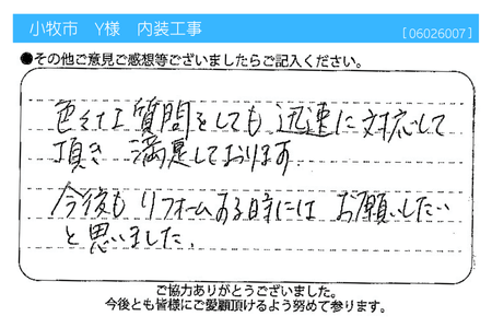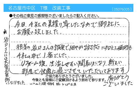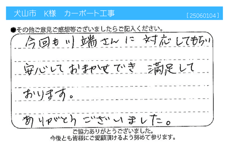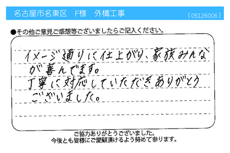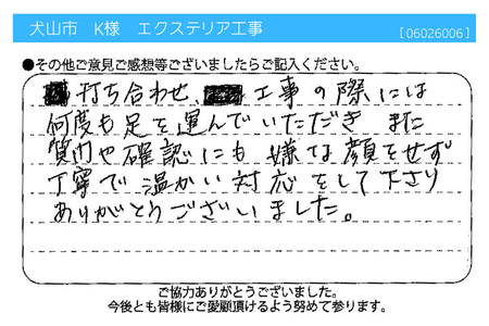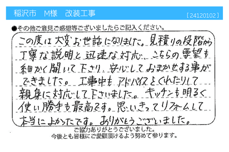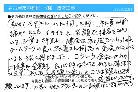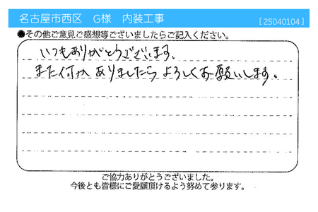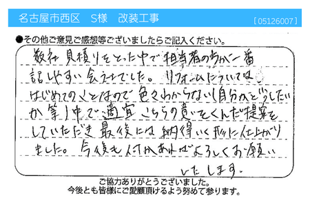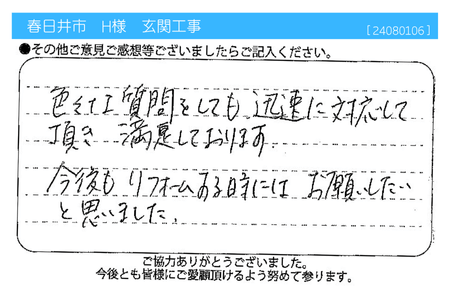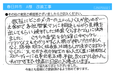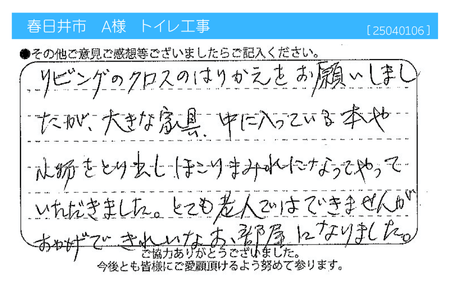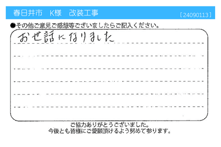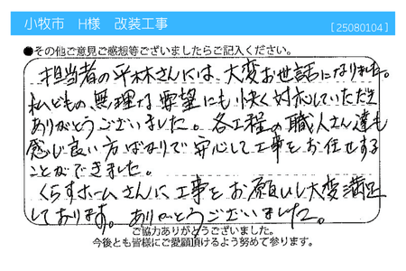 一覧 < new back > 2025/11/18 お客様の声 くらすホームで工事をされたお客様からいただいた“実際のお声”を掲載しています。 手書きアンケートの原本とともに、仕上がりや対応への率直なご感想をご紹介しています。 一覧 < new back >