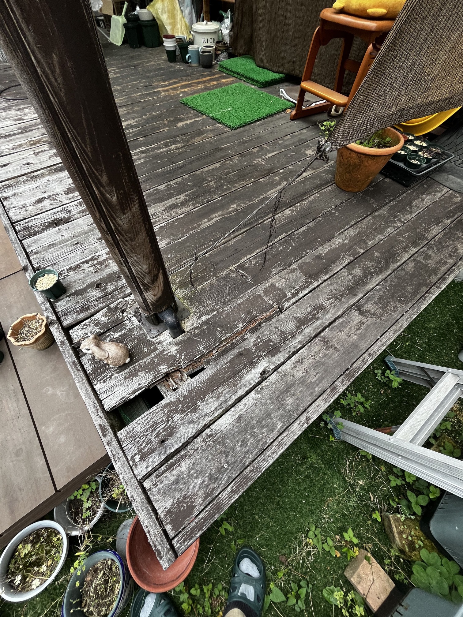 経年劣化でウッドデッキが腐食し、踏み抜いてしまいそうな状態でした。