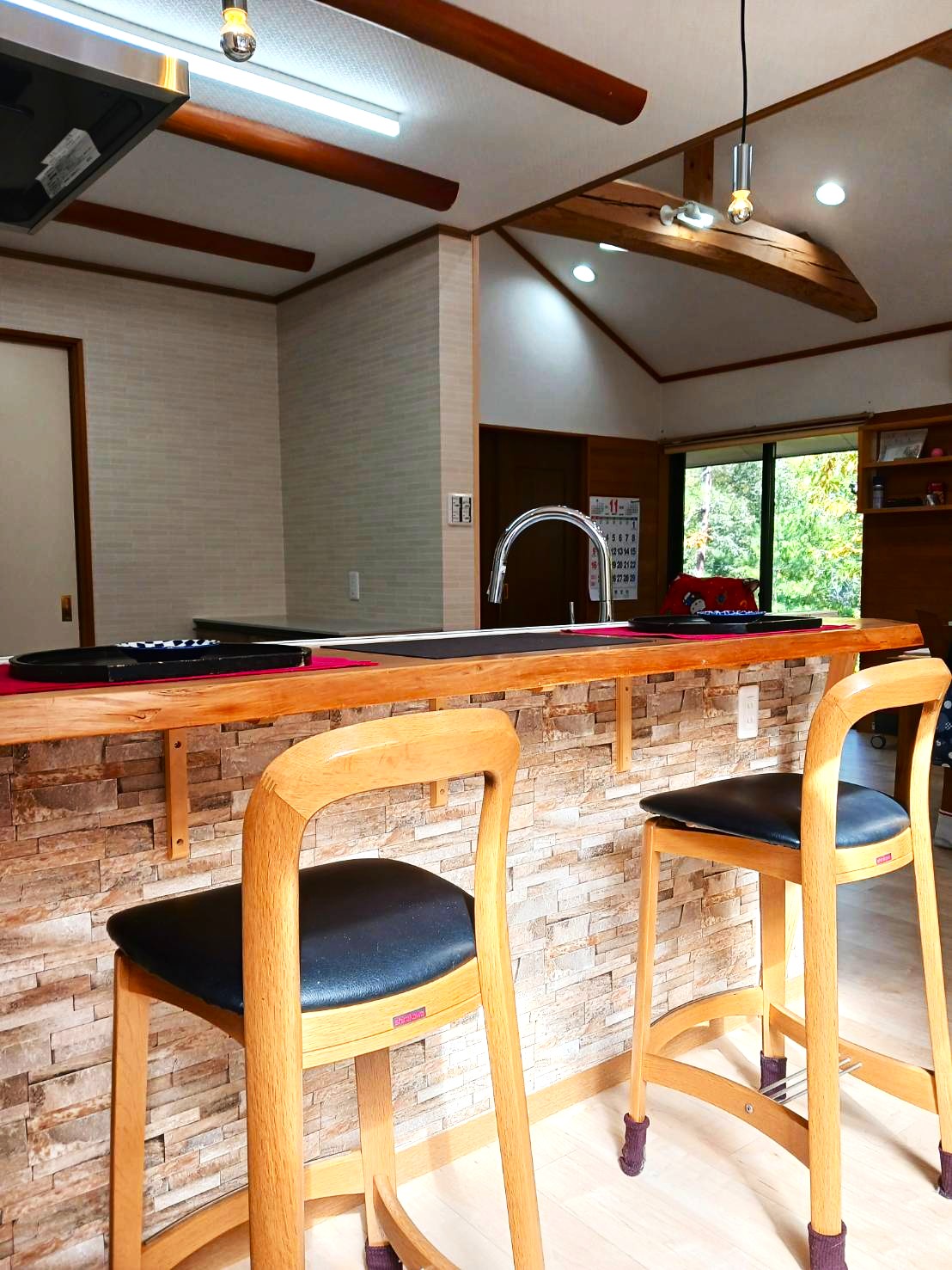 既存の化粧柱を再利用し、天井のアクセントとして取り入れることで、空間に統一感と温かみをプラスしています。