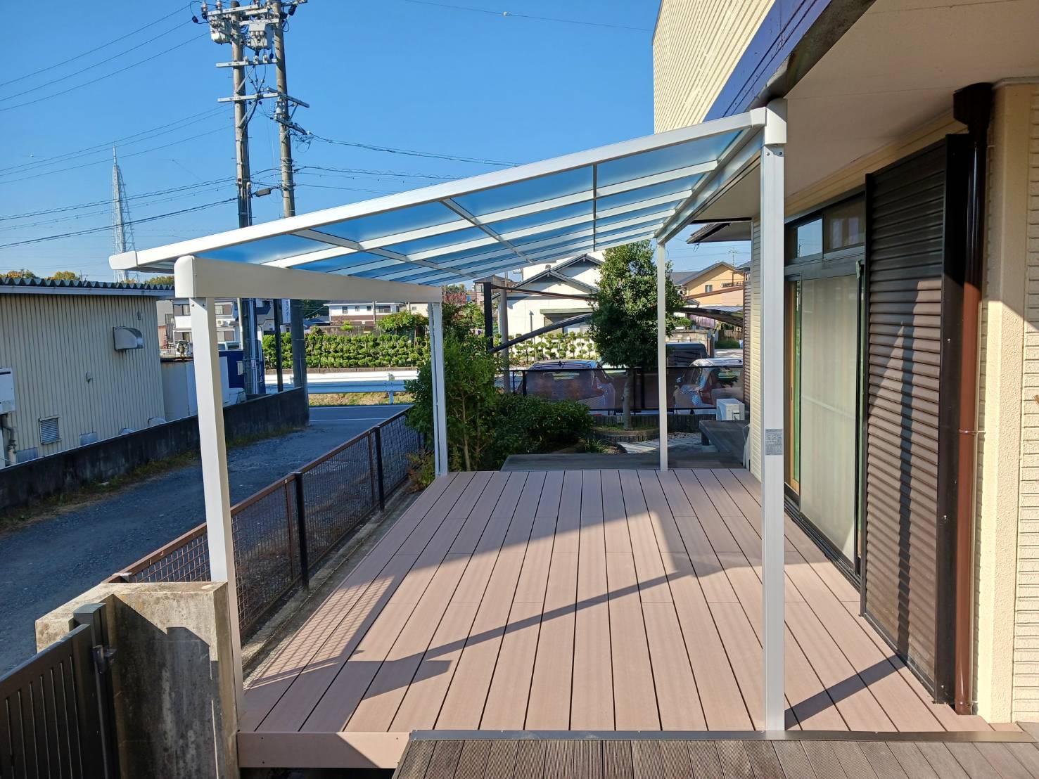 テラスはLIXILの「スピーネ」という商品、ウッドデッキにはLIXILの「木ら楽ステージ」という商品を今回は採用させていただきました。晴れた日には紫外線を気にせずに外でゆったりとくつろげます。ウッドデッキも人工木なのでメンテナンスもしやすいです。今のウッドデッキは本当の木のような手触りや見た目をしてるので、生木のウッドデッキも最高ですが、メンテナンスや耐久性を考えるなら人工木デッキがおススメです(^^)/